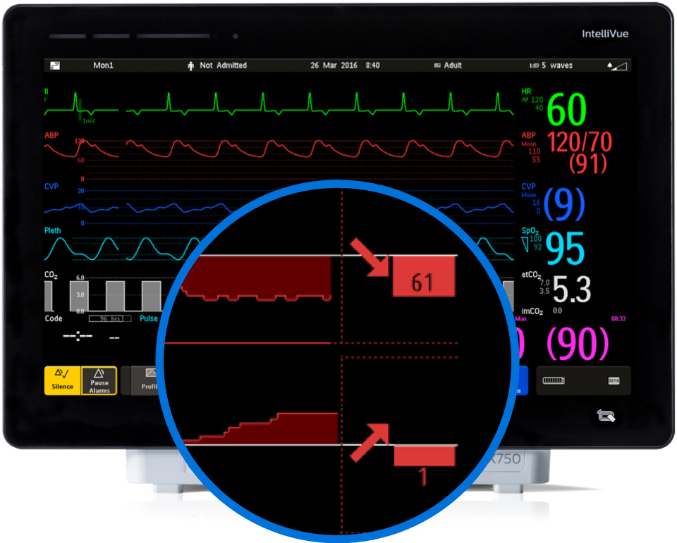Las herramientas de apoyo en la toma de decisiones clínicas nunca han sido tan importantes para los equipos de atención aguda sobrecargados. Los médicos suelen tener un tiempo breve para revisar un monitor, por lo que la información debe presentarse de la forma más sencilla posible. Las herramientas de apoyo en la toma de decisiones clínicas de Philips están diseñadas para reducir la carga cognitiva, reconocer el deterioro del paciente y proporcionar una retroalimentación rápida sobre la eficacia de las intervenciones terapéuticas.