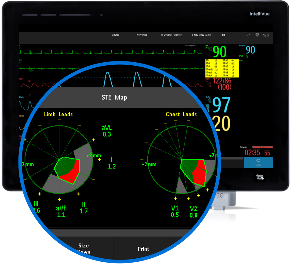 • Obtenga detalles adicionales para pacientes de cuidados agudos al comparar los valores de ST con los límites de elevación de ST a través de la función STEMI Limit Map/STE Map.